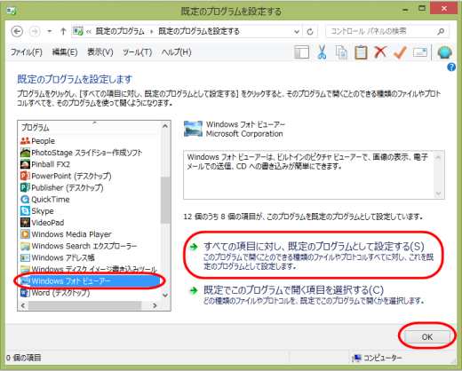 「コントロールパネル」−表示方法を「大きいアイコン」に変えー「既定のプログラム」ー「既定のプログラムを設定」ー利用するプログラムを選択し「すべての項目に対し、既定のプログラムとして設定する」を選びます
