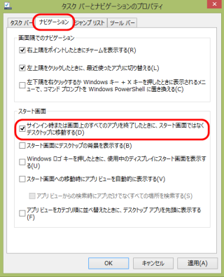 「タスクバー」を右クリックー「プロパティ」−「ナビゲーション」タブを選択ー「サイン時または…デスクトップに移動する」にチェック